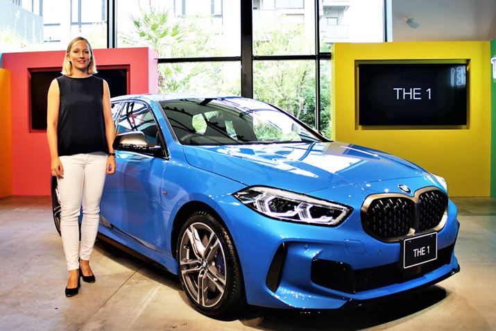 BMW 新型「1シリーズ」(M135i xDrive)と、ビー・エム・ダブリュー BMWブランド・マネジメント本部長のミカエラ・キニガーさん