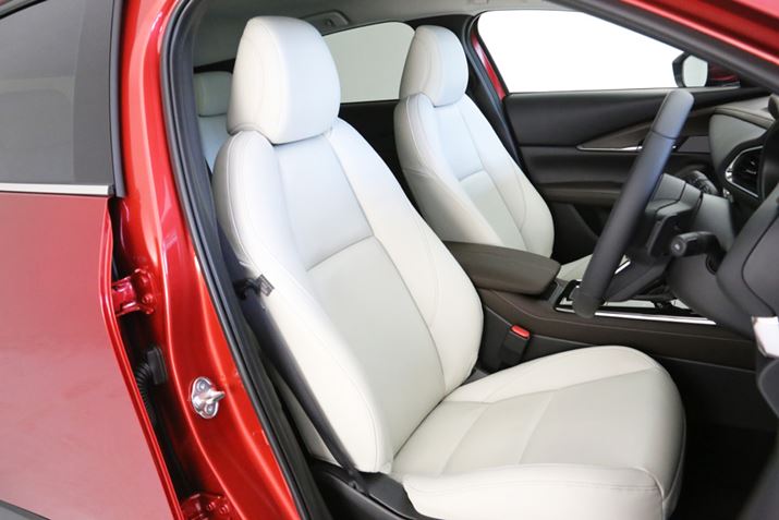 インテリアでは、CX-3よりも広い室内空間に注目したい。シートの左右間距離はCX-5と同じ740mmで、CX-3よりも50mm広くなっている。また、前後席間距離はCX-3と比べて26mm拡大され、後席の頭上空間はCX-3よりも約20mm広くなった。