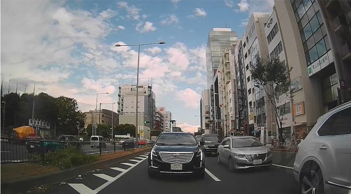 上記のMR745(上画像)と従来モデル(下画像)で同時に撮影した映像を比較してみると、MR745がどれほど広角になったかがおわかり頂けると思う。MR745の画角は、他社製品を含む2カメラドライブレコーダーのなかでトップクラスの広さを誇っている。撮影範囲が広ければ、万が一の際に撮影されていなかったということも少なくなり、映像の証拠能力としての有用性が高まる。ちなみに、リアカメラについてはMR745と従来モデルで同じ画角(水平100°垂直52°対角111°)だ。