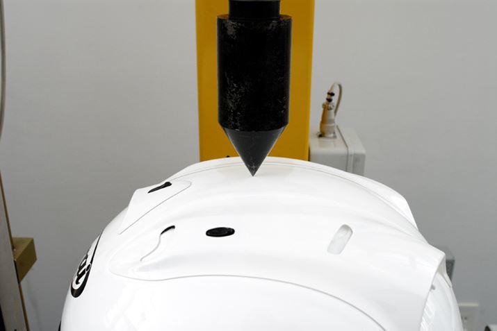 耐貫通性能テストは、先が尖った落下装置(ストライカ)を垂直落下させ、頭に触れる深さまで突き抜けないかでチェック。このテストでストライカを落下させる高さがJIS規格は2mなのに対し、SNELL規格は3mと基準が異なる