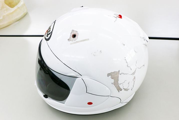 SNELL規格のテスト後のヘルメットを見ると表面の損傷は激しい。この姿を見ると、より安全性の高いヘルメットを装着したいと感じる