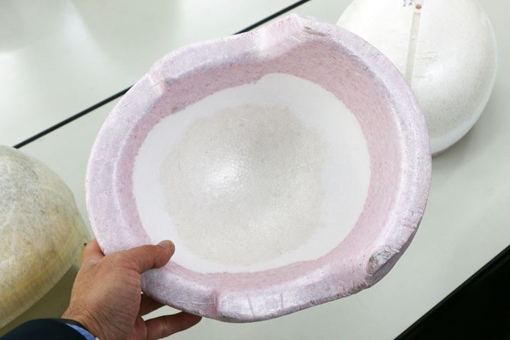 さらに、帽体の中には緩衝体となる発泡スチロールを配置。転倒時、外側からの衝撃と同時に内側からもかかる圧力を発泡スチロールが吸収してくれるのだ。この素材も独自開発した特殊なもので、頭頂部や側頭部など場所によって硬さを変えている