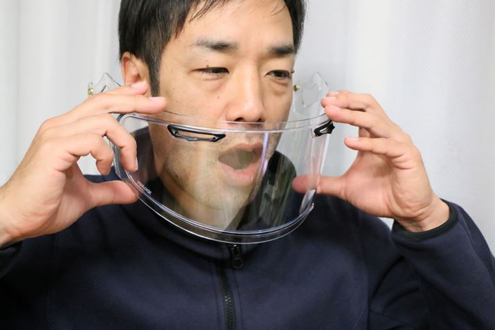 オプションの「ピンロックシート」を装着すると、よりクリアな視界を確保できる。試しに息を吹きかけてみたが、まったく曇らない!