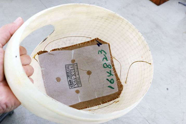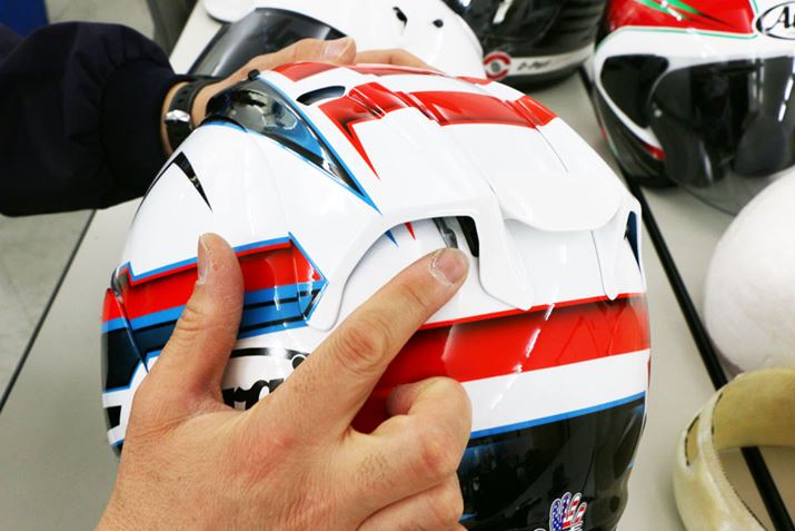 2つめのポイントは、帽体の強度。昔は、ヘルメットは破損することで衝撃を吸収すると言われていた時代もあったが、アライは事故で受ける衝撃は1回だけではないので、1度で破損してしまっては意味がないという考えから、連続して加わる衝撃を受け止めるのではなく、かわし続けられる強度が必要だと導き出した。そのことから、1952年に製造された初代モデルから破損しにくいFRP(ガラス繊維などで強化されたプラスチック)を帽体に採用。その後、素材の進化とともにFRP製の帽体の強度はますます高まっている。さらに近年は、帽体の主材料となる素材「スーパーファイバー」も、アライ独自の強度が高いものが使われるようになった。