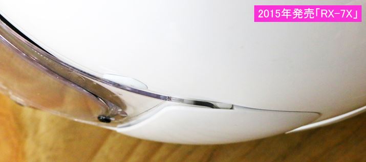 シールドの取付部も「RX-7X」のほうが薄い。薄肉化することで内側への張り出しも少なくなり、衝撃吸収部分をより厚くできるようになったほか、転倒時に路面にこの部分が引っかかりにくくなった