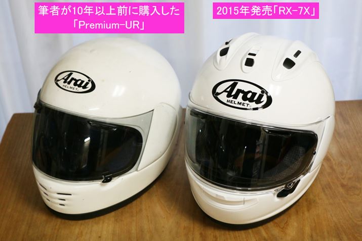 筆者がこれまで使っていたモデル(左)より、「RX-7X」はシールドの取付部が下がっていることがわかる