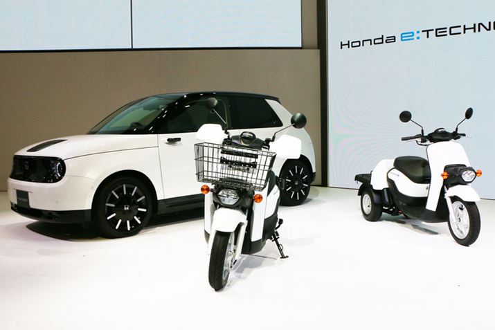 4輪車「ホンダe」とともに展示されていた「BENLY e」(左)と「GYRO e」(右)。参考出品だが、市販化(リース販売を含む)を前提に開発されている