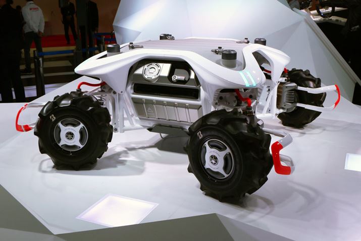 ヤマハが「陸上のドローン」と呼ぶ、自律走行する「Land Link Concept」も出展。障害物を避けながらオフロードも走れるので、草刈り機などのオプションを装着した使い方を想定しているという