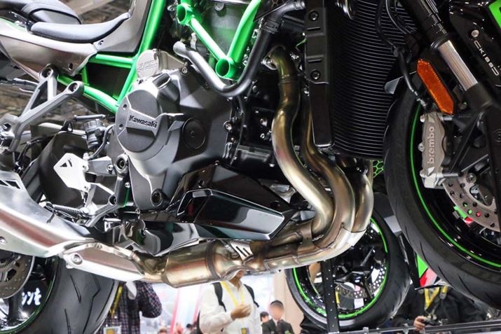 カウルがなく、むき出しになるとなおさら迫力を感じるスーパーチャージドエンジン。「Z H2」専用のセッティングが施され、低中回転の加速力が向上しているとのこと