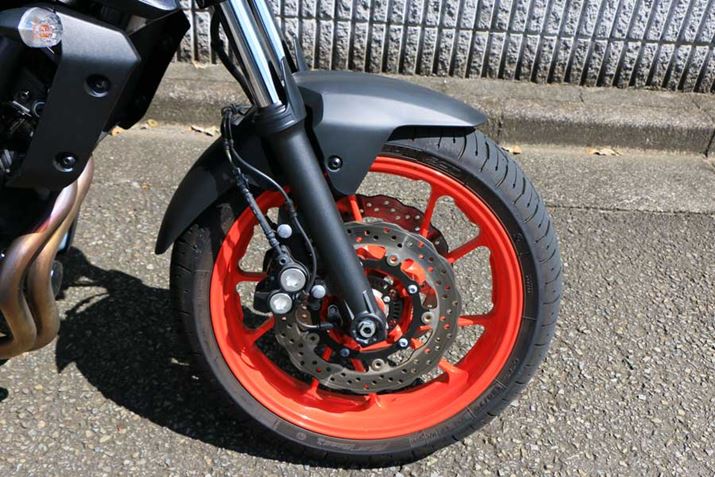 MT-07が支持される理由を探るべく、車体まわりにも目を向けてみた。差し色にオレンジと朱色の中間のような「バーミリオン」カラーを使っている外観は目立ち度が高いが、装備はかなりスタンダードな構成だ。フロントフォークは近年のスポーツモデルでは一般的な、見るからに剛性の高そうな倒立式ではなく、太さ41mmの正立式。ブレーキもダブルディスクだが、スポーツ性を強調したモデルに装備されるラジアルマウントではなく、通常のマウント方式となっている。メーターにおいても、デジタル式を採用してはいるが、走行モードの切り替えやトラクションコントロールなどの電子制御機能は非搭載で、クイックシフターやスリッパークラッチなども装備されていない。