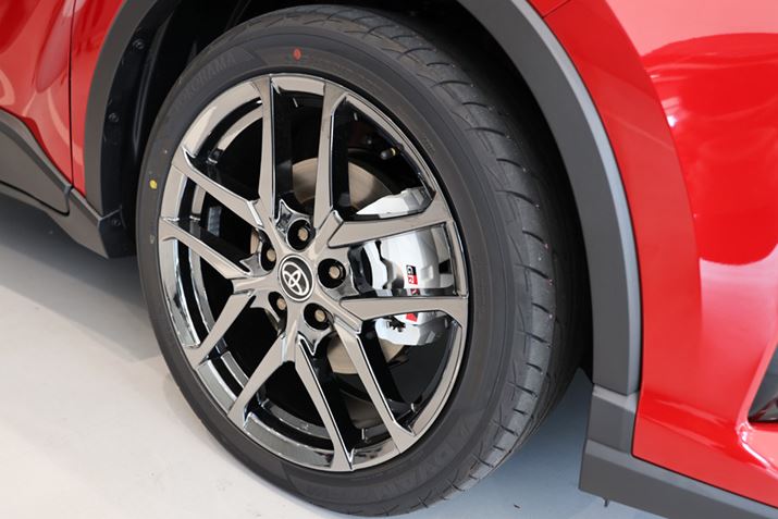 19インチのアルミホイールはデザインがよく工夫されていて、高い強度ながらもスポークは細身となっており、ブレーキキャリパーもよく見えます。このブレーキキャリパーは専用塗装で、フロントブレーキキャリパーにはGRのロゴが入っています。