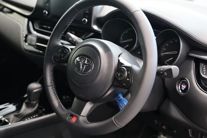 ステアリングにも工夫があって、上部と下部で断面の形状に違いがあります。ステアリング上部の断面は真円に近い形状ですが、直径は細めです。10時10分の位置あたりが太めになっていて、交差点などで大きめにステアリングを操舵するときには、太めのグリップから細めのグリップへの移動がスムーズに行えます。ステアリング下部は、高速巡航時に楽な姿勢を取りやすいように円をつぶしたような形状となっています。C-HR GR SPORTは、ステアリング断面に大きな変化をつけることで、操作性を大きく向上させています。