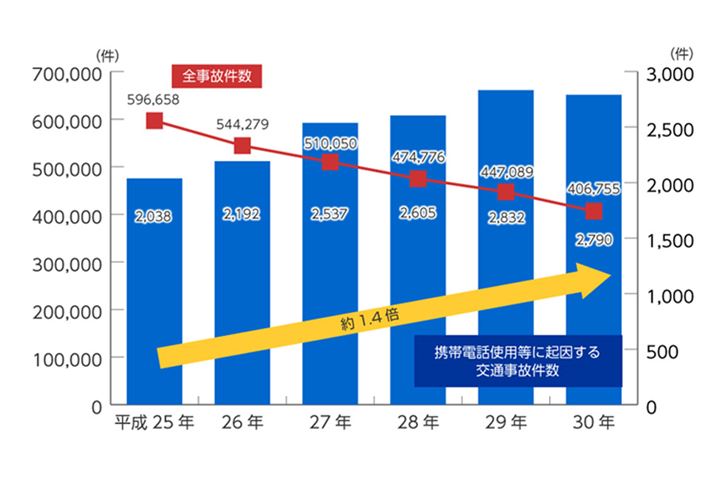「携帯電話使用等に起因する交通事故件数」は、携帯電話などを通話目的、及び画像目的で使用したことや、カーナビなどの注視に起因して発生した交通事故件数のこと。また、携帯電話及びカーナビのどちらも使用していた事故については1件として計上。政府広報オンラインより。数値提供:警察庁