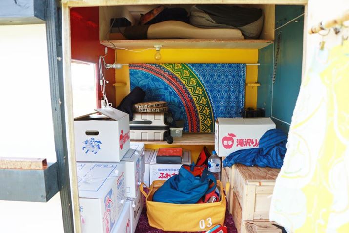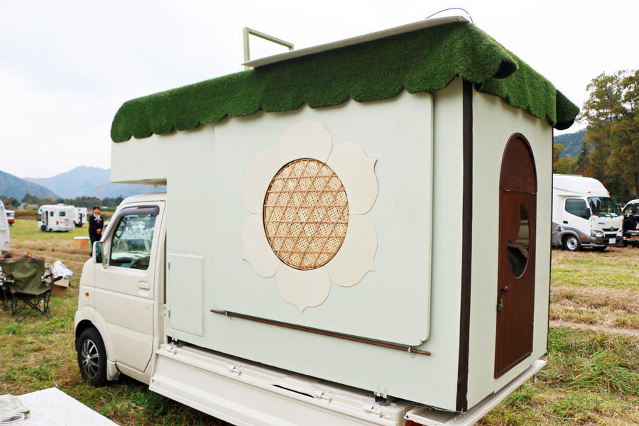 1年ほどかけて作り上げたという河野さんのモバイルハウスは、車内の床から畳を浮かして設置したり、明り取りの窓を設けたりと、女性らしい細やかな配慮が随所に感じられる。このような仕上がりを見ると、もともと何かを作っていた経験があるのかと思ったら、なんと、モバイルハウスを自作するワークショップに参加したことがきっかけだという。しかも、元ペーパードライバー! モバイルハウスを作り上げてからは、京都から秋田まで、この家に泊まりながら旅をする生活スタイルに一変し、多くのモバイルハウスが集まる当イベント「キャンパーフェス」を主宰するまでになっているのだから、驚きだ。人生を大きく変えてしまうほど、モバイルハウスは楽しいものだということがわかる。