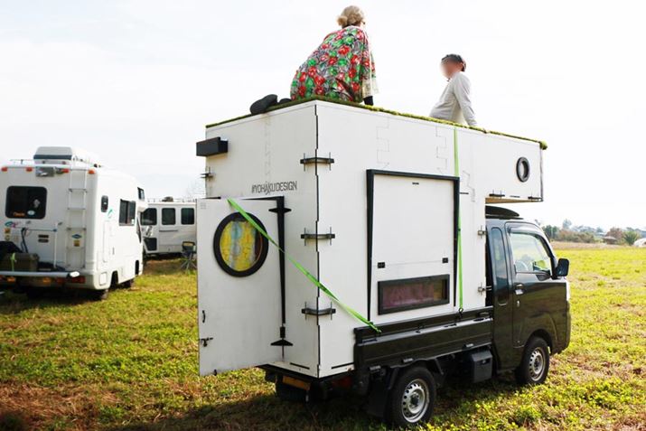 青森から長野県白馬村まで、ひとりで軽トラを走らせてやってきた彼女のモバイルハウスの屋根には、多くの人が上って楽しんでいた。このように屋根に乗れるのは、自作モバイルハウスの世界では定番だ