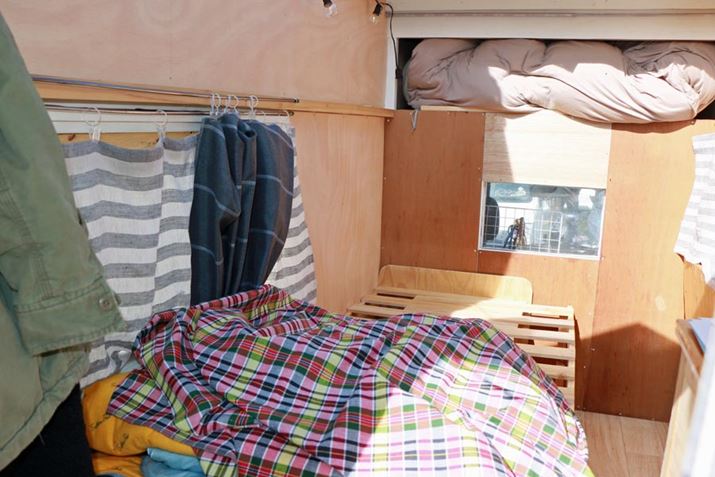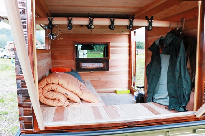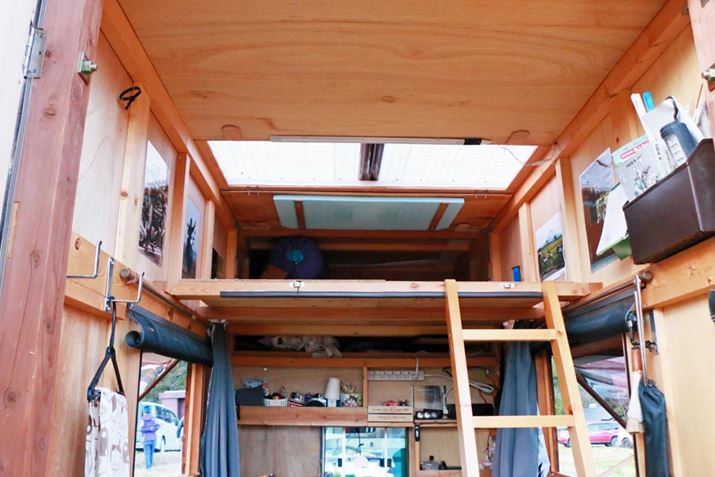 スペース効率を考えるなら、高さを利用するという手もある。それを着実に実行していたのが、このモバイルハウス。室内にロフトを設けることで、2人分の就寝スペースを確保している。もちろん、ひとりで使う時にも荷物をロフトに入れておけば、居住空間が広々と使えるのでいい!
