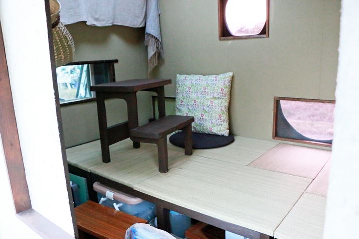 木で作る場合、室内もウッド調になることが多いが、河野さんのモバイルハウスは和風の仕上がり! 畳を敷いてあるので、くつろぎ度は満点。日の光が入る窓にピンク色のフィルムを貼り、遊び心をプラスしているのもユニークだ
