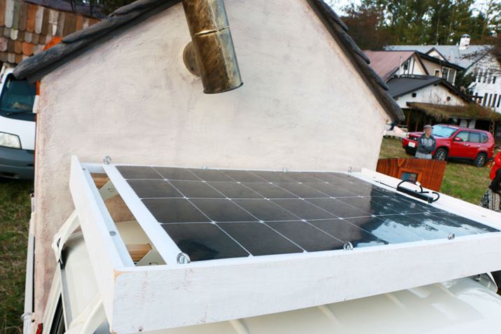 かわいいだけでなく、快適性を高めるため、軽トラの屋根にはソーラーパネルが設置されている。天気がよければ、1日でひと晩分の電力が余裕で溜められるという