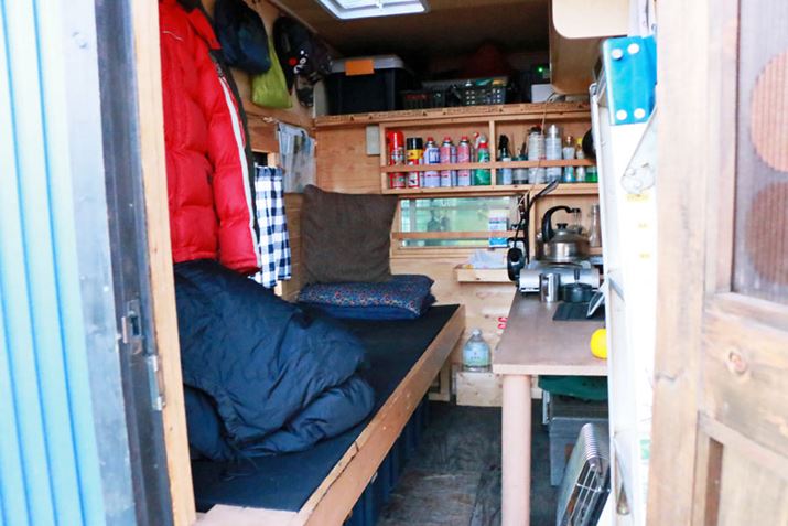 まだ中の荷物を降ろしていないため、室内は段ボールでいっぱいだが、ここに就寝スペースができるという。また、壁の中には断熱材も入っているとのこと。知識のある人に教えてもらいながら作っただけあって、初めてとは思えないほどしっかり作られている