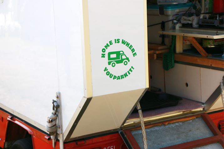 残念ながらオーナーに話を聞くことはできなかったが、これぞモバイルハウスという作りの1台を紹介しておきたい。モバイルハウスは背が高いと、走行中に風などの影響を受けやすいが、このモバイルハウスは比較的高さが抑えめ。かつ、前側の傾斜を多く取ることで空力性能を高めているように思われる。レトロでポップなデザインだけでなく、走行性能も考慮しされていそうなところに、オーナーのセンスを感じずにはいられない。