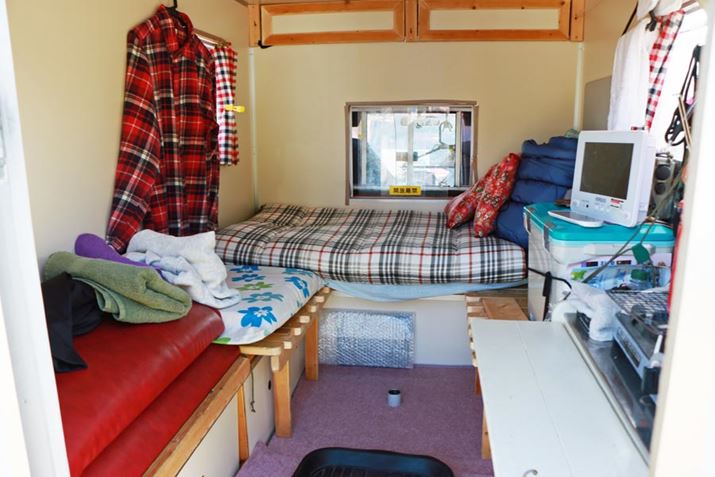 室内にはベッドや作業用の机が設置され、広くはないが過ごしやすそう。工具などを収める棚も作り付けられている