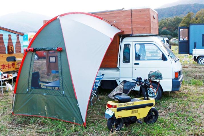 しかし、逆サイドに回るとタープが! 側面に設置できる構造を設けているのだそう。ちなみに、手前にある黄色のバイクは、ホンダがかつて販売していた、ハンドルを折りたたんでコンパクトに収納できる「モトコンポ」。実は、こいつがもっとも注目を集めていた(笑)