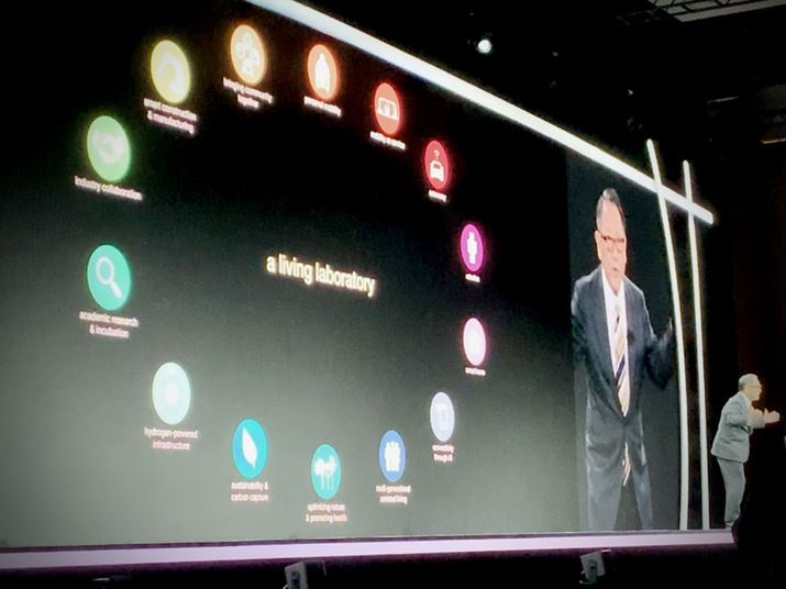 スライドで示されたのは「a living laboratory(生きた実験室)」というコンセプト。テストコースではなく、実際に人が暮らしそこでモビリティを中心とした先端技術の開発、検証が行える場所の創出を目指しています