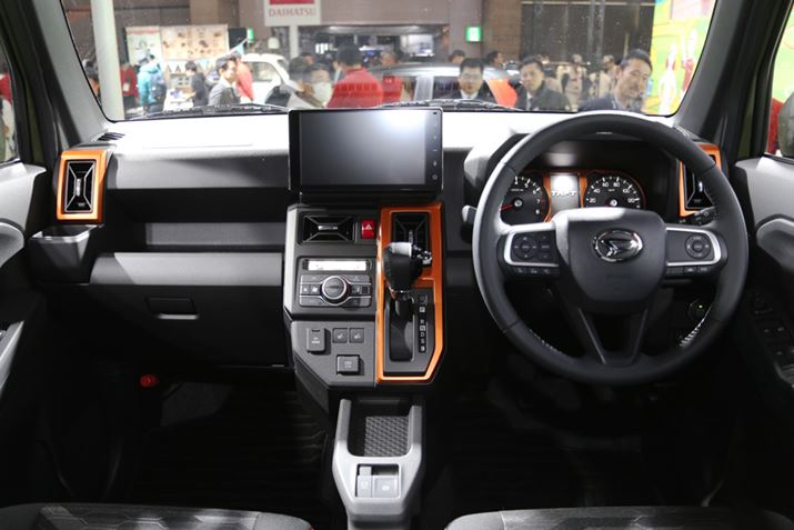 新型「タフト」のインテリアは黒基調で、SUVらしくアウトドアツールのようなオレンジ加飾が、センターコンソールやエアコン吹き出し口などに採用されている