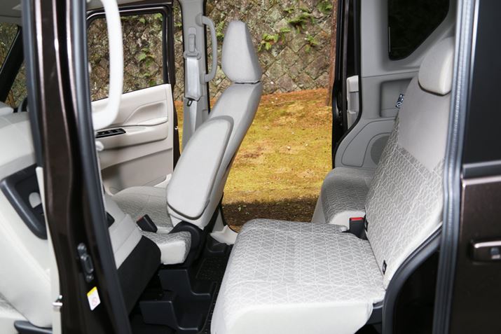 助手席の肩口には「助手席前倒れ用レバー」が搭載されており、レバーを引くだけで助手席が前に倒れて、運転席から後席にアクセスしやすくなるような工夫が施されている。このレバーは、「eKスペース」には全グレードで標準装備されており、「eKクロススペース」では「G」と「T」にメーカーオプションとして設定されているものだ