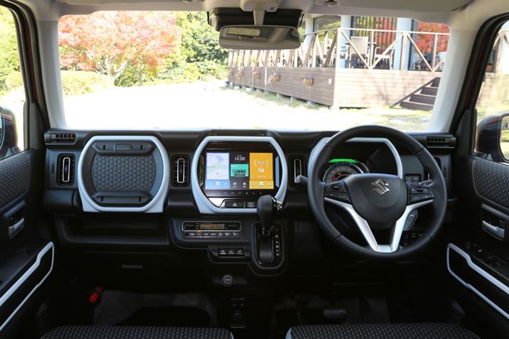 スズキ 新型「ハスラー」のインパネとフロントシート。基本的には「ワゴンR」ベースなのだが、そう思わせないような工夫が、いたるところに施されている