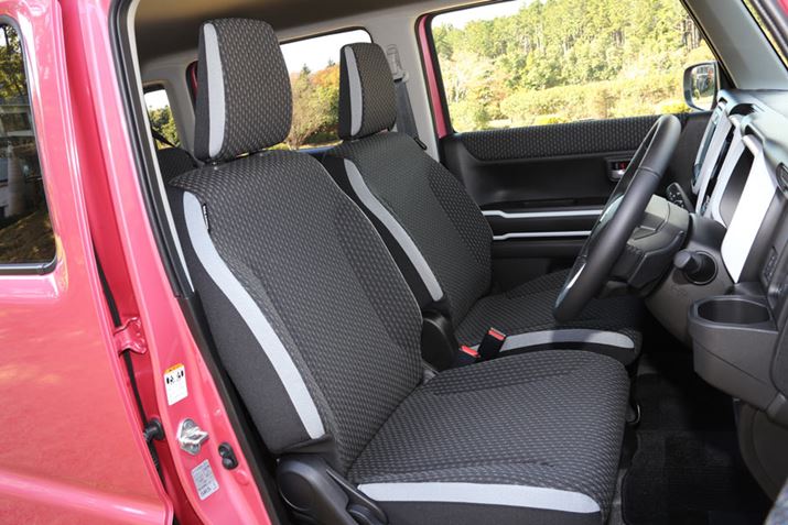車内空間やシートなどは、「ワゴンR」がベースだ。前席は、床と座面の間隔に十分な余裕があり、頭上空間も広い。フロントシートは、乗員の体重が加わる背もたれや座面のうしろなどがしっかりと造り込まれていて好印象だ。