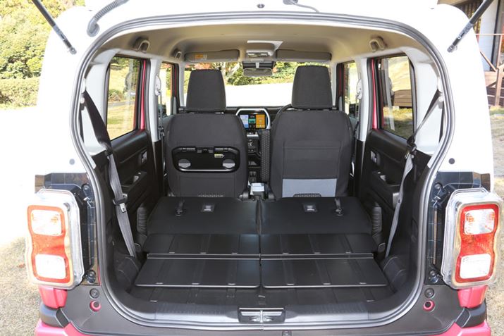 スズキ 新型「ハスラー」のラゲッジルームは、リアシートを倒すとフラットになり、表面は防汚タイプとなっているのが特徴だ