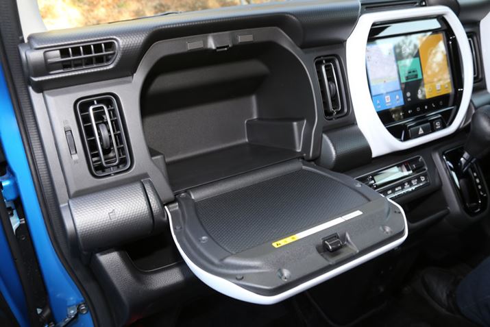 スズキ 新型「ハスラー」の特徴のひとつである「インパネアッパーボックス」は、「X」グレードはテーブル機能が付いたふた付きタイプ(画像)で、「G」グレードはふたのないオープンタイプになる