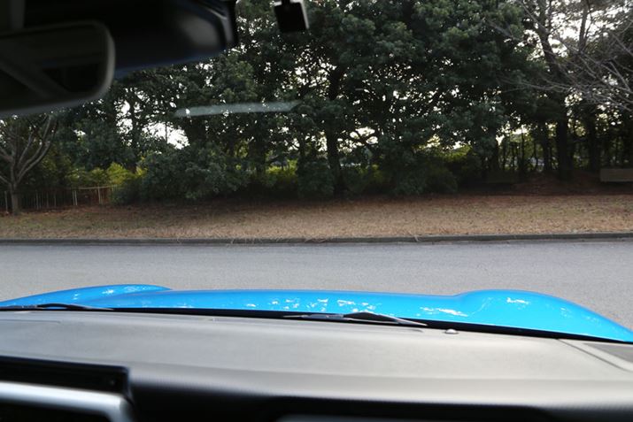 新型ハスラーの運転席に座って前方を見ると、クルマの先端がしっかりと視野に入るので、前方左右の車幅感覚がつかみやすい。新型ハスラーは、先代よりもエンジンフードが地面と水平になっているので、ドライバーからエンジンフードが見える範囲も広がっている。