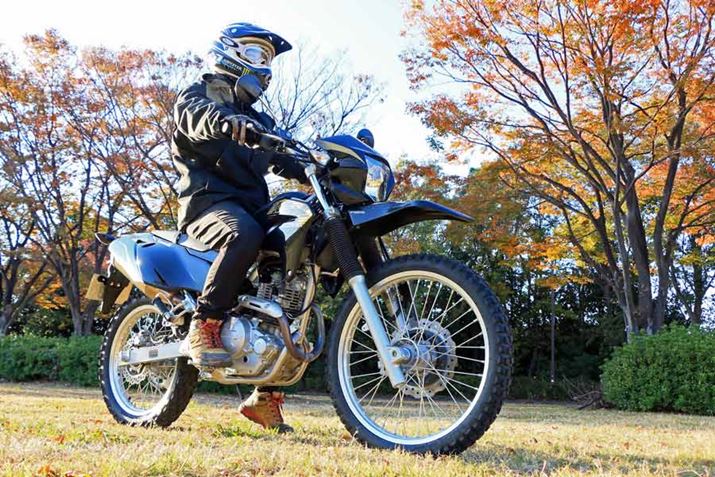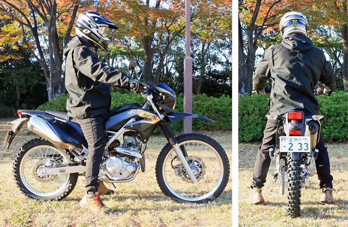身長175cmの筆者がまたがると、両足のつま先がべったりと接地した。シート高は885mmと、このクラスの公道用オフロードバイクとしては高めだが(KLX250は890mm)、シートまで含めて車体がスリムなため足つき性は上々。重量134kgなので、片足で支えても不安感はない