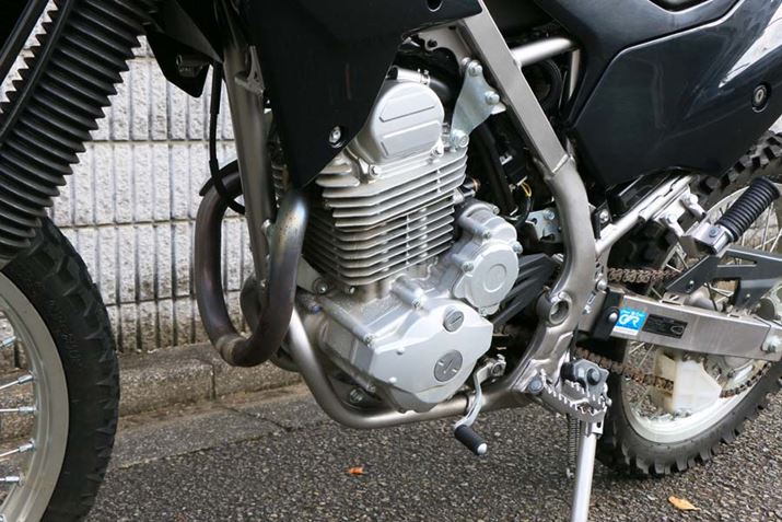 長いタンクを装備するため、水冷のDOHCエンジンから空冷のSOHCエンジンに変更。空冷232ccのSOHCエンジンの最高出力19PS。最高出力24PSだったKLX250と比べると見劣りするが、最大トルクは19Nm と、KLX250の21Nmと比べて大きく落ちてはいない