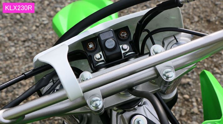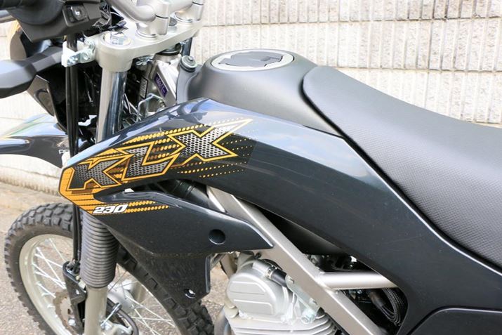 KLX230Rのサイズは2,045(全長)×840(全幅)×1,200(全高)mm。エンジンはKLX230と同一だが、ライトやウィンカーなどは装備されておらず、ナンバーの取得もできないため公道走行はできない。メーカー希望小売価格は517,000円(税込)