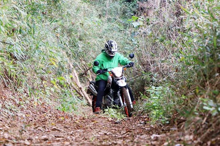 そして、低回転から力が出る特性のエンジンはオフロードとの相性がバツグン! KLX250の水冷DOHCエンジンは高回転ではパワーがあるものの、未舗装路ではなかなかそこまで回すことはできない。いっぽう、KLX230に搭載された空冷SOHCエンジンは回転数に関わらずアクセルを開ければトルクが出てくれるので、凹凸やすべりやすいポイントのあるオフロードでこそ生きてくる。オフロードでは、KLX250よりKLX230のほうが速く走れそうだと感じたほどだ。