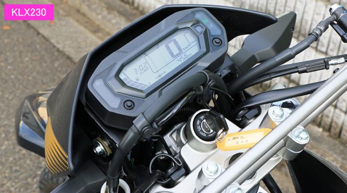 またがってみると、車体は思った以上にコンパクト。筆者は以前、KLX250と同じエンジンと車体にオンロードタイヤを組み合わせたモデル「Dトラッカー」に乗っていたことがあるが、KLX230はひと回り小さく感じる。