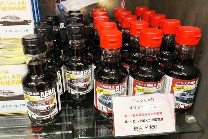 「頭文字Dオリジナル醤油」は、だしを加えた豆腐専用の醤油(黒いフタ)と、丸大豆仕込みの本格派醤油(赤いフタ))の2種類をラインアップ