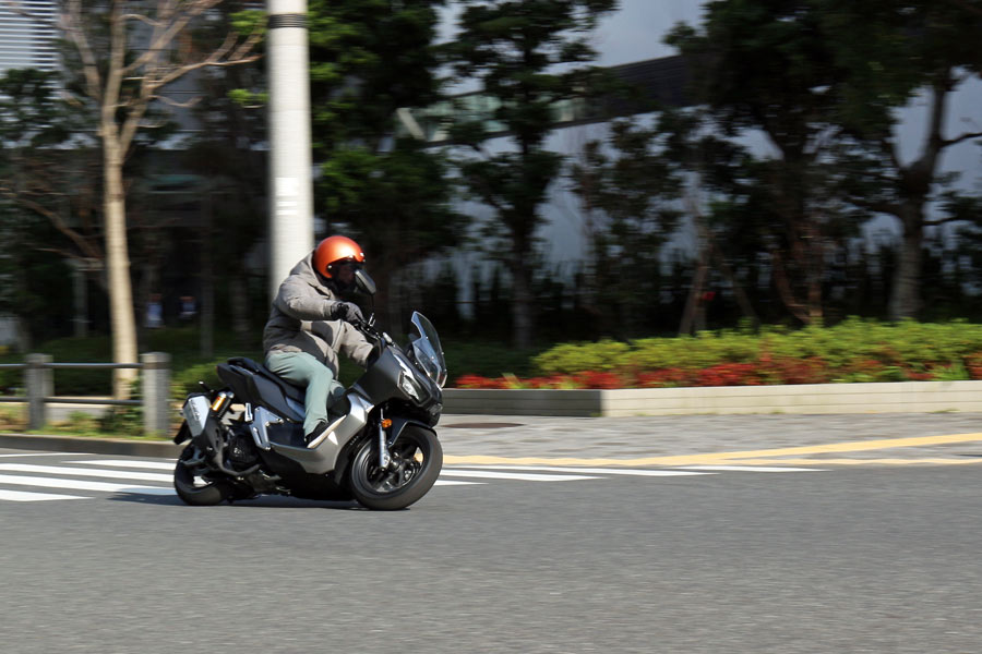 まずは、スクーターとしての使い勝手を街中でチェック。アクセルを開けるとグッと車体を押し出すようなトルクはベースとなったPCX150よりも強く、右手を軽くひねるだけで交通の流れをリードできる。大柄に見える車体だが、実際に乗ってみると取り回しはよく、狭い路地でもてあますこともない。安定志向が強い印象はあるが、このクラスのスクーターらしい小回りのよさは損なわれていないので、街中走行で多い、裏道を抜けるような走りも得意だ。