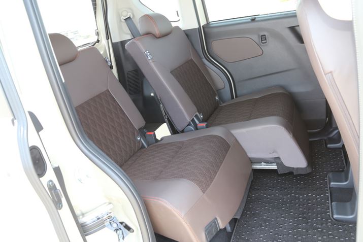 三菱「eKクロススペース」のリアシート。リアシートには、前後の「スライド機能」が採用されている。スライド量は320mmと大きいので、リアシートを後ろへ下げてゆったりと座ったり、前へ動かして荷室に荷物をたくさん載せたりと、使い勝手が高そうな機能だ