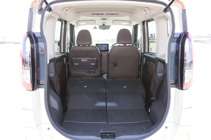 リアシートの背もたれを前方に倒すと、座面も連動して下がり、大容量の荷室に変更できる。広げた荷室の床には少し傾斜ができるが、天井が高いので自転車のような大きな荷物も積みやすい。前後スライド、格納機能ともに左右独立式だから使い勝手もいい。
