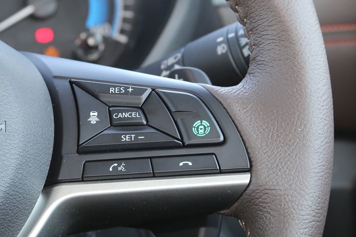 三菱「eKスペース」のステアリング右側に備えられている「マイパイロット」作動スイッチ。日産車に採用されている「プロパイロット」と基本的に同じものだ