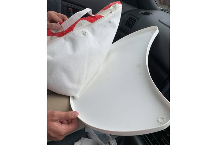 また、ハンドルに取り付ける「車内用ハンドルテーブル」を利用するという方法もあります。ハンドルテーブルも同様に、ノートPCがしっかりと収まってマウスを操作するスペースがある、大きなものを選んだほうがいいですね。