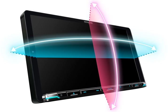 MDV-M907HDFのディスプレイは、位置を調整することが可能だ。奥行きを2段階、高さを4段階で調整できる。さらに、ディスプレイの角度を手前に60°、奥に10°まで動かすことができるので、たとえば日差しが当たって見えにくいときなどでも、ディスプレイの角度を変えることで、見やすい位置へと調整することができる。