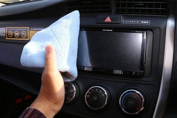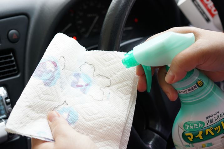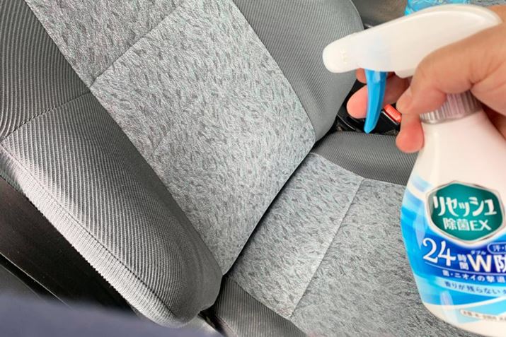 クルマの消毒に使う場合は、「かんたんマイペット」をタオルなどに吹き付けて、内装(本革部分を除く)を拭くといいでしょう。シートや布部分の内装、フロアマットには「リセッシュ除菌EXシリーズ」がおススメです。