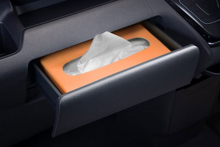 日産「ルークス」は、数多くの収納設備を備えている。画像は、助手席前に備えられている「インストスライドボックス」。スリムタイプのティッシュボックスを収納することができる