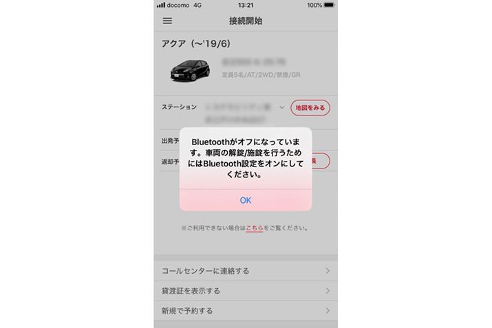 予約した時間になると、アプリ上に「利用開始する」というボタンが表示されます。ここで、このボタンを押すと利用開始になる……はずだったのですが、筆者のスマートフォンのBluetoothがオフになっていたので、オンにしてくださいと表示されました。