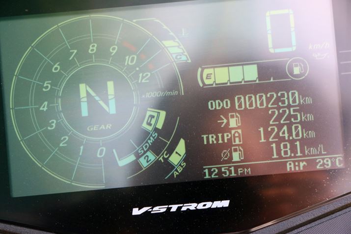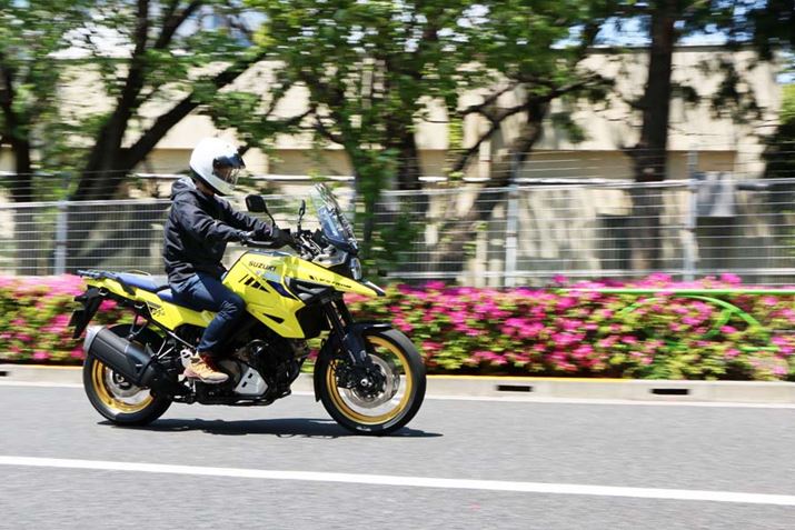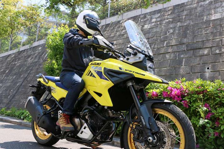 車重が247kgあり、重心位置も高いので、手押しで移動するのは結構重い。しかし、エンジンをかけて走り出すと、その重さはまったく感じなくなる。以前、ホンダのアドベンチャーバイク「CRF1100L Africa Twin Adventure Sports ES」に試乗した際にも同様のことを感じたが、走り出してからの軽快感はVストローム1050XTのほうが上だ。